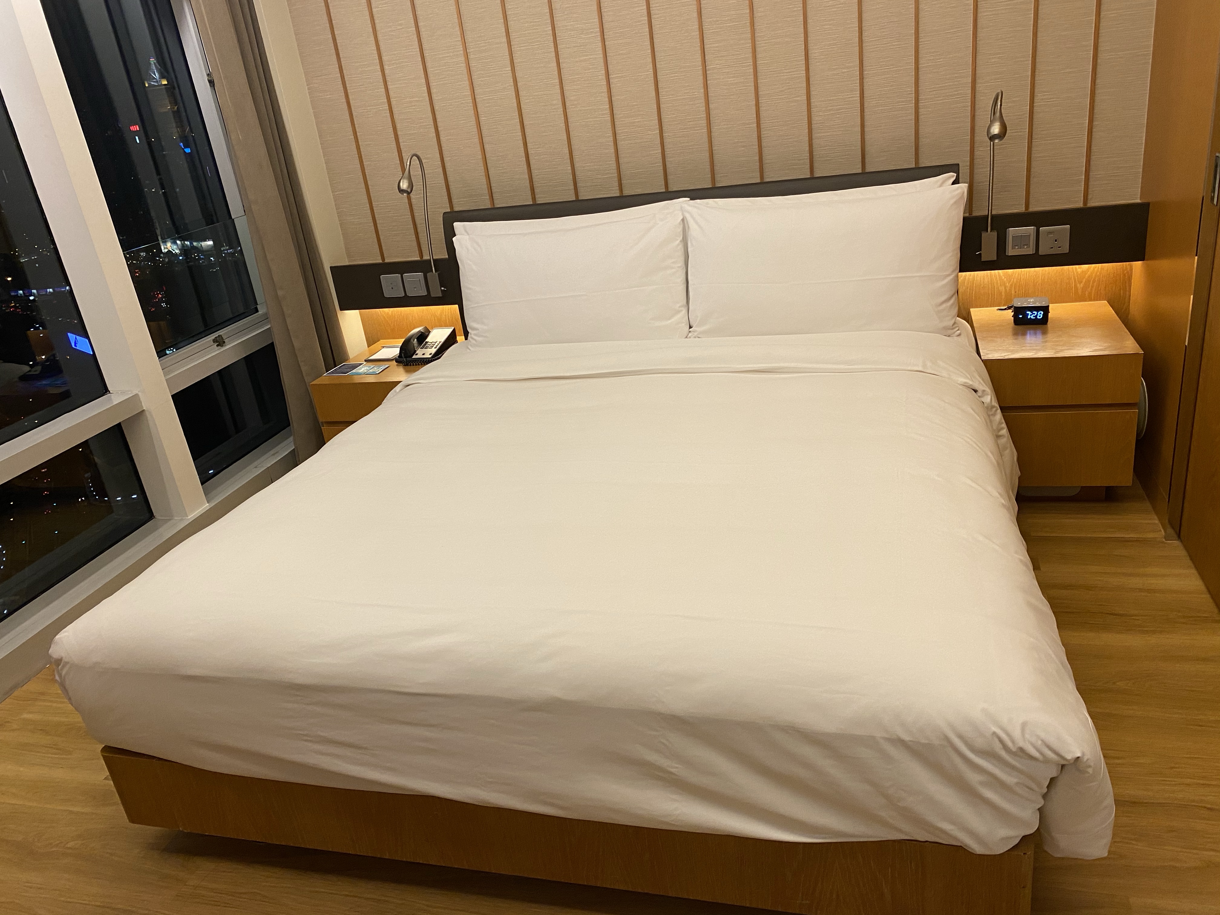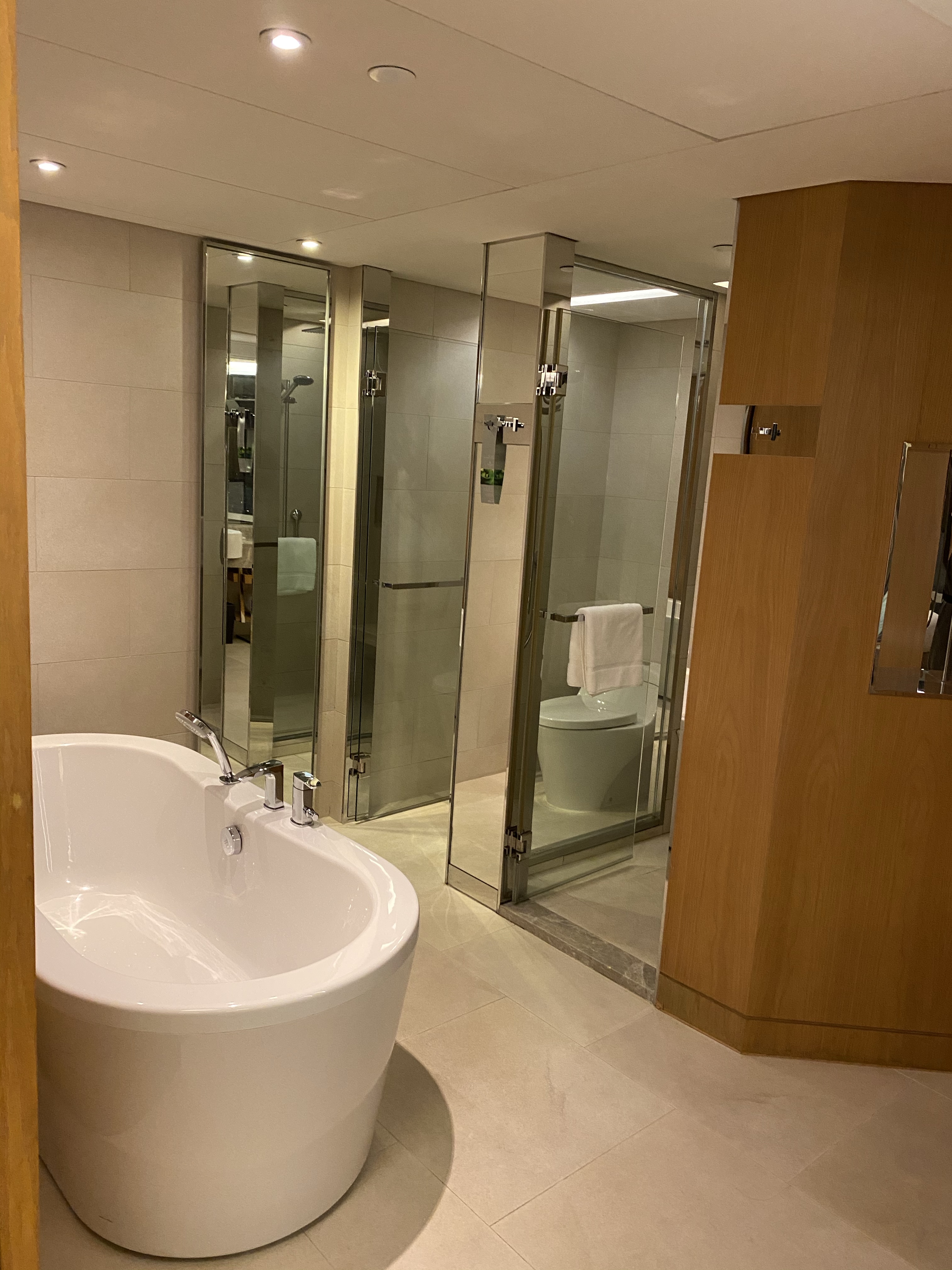 我就覺得呢個房型幾好着啦,因為可以有180度嘅維港景色欣賞,而且係浸浴嘅時候亦都可以望到出面嘅風景;客廳方面又夠大,放張蓆出嚟做瑜伽都仲得。瞓醒起身見到咁靚嘅維港景色,真係令我成日嘅心情都咁好!